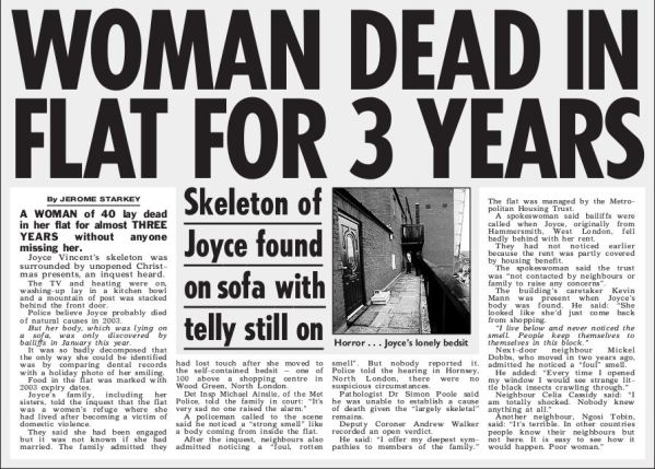The decontamination squad scraped the remains of 38-year-old ex-City professional Joyce Vincent from her seat, in front of a TV which had flickered unseen for three years. They took her wrapped Christmas presents too, and left unsolvable mysteries. How did she die? And how does someone become so alone that they’re left in a north-London flat above a busy shopping centre till their body melts into it?