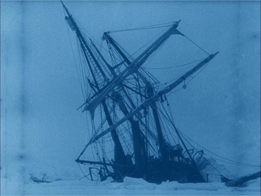 South begins with Shackleton’s departure, on 26 October 1914, from amid the thronging port at Buenos Aires, before on-board shots of the crew, their 70-strong company of Canadian sledge dogs, of ice breaking and the shifting floes. Yes, as Briony Dixon writes, this “conformed to the pattern of previous films of the early part of the expedition.” Regardless, the components of narrative are all in attendance. Shackleton is our protagonist, Worsley his sidekick. There is a chorus, or narrator, too: in the intercession of explanatory frames, appropriately penned with a flavour of the upper-class English gentleman, providing such delightful phrases as “Shackleton at the binnacle”, and “Giant Petrels. A most ungainly and quarrelsome species.” We have foreshadowing, in the crab-eater seals, migrating north in advance of the incoming freeze that, unbeknownst to the crew, would be Endurance’s captor and executioner. And there is tragedy in the film. And in what it omits: months of marooning, and the meat of Shackleton’s desperate voyage to South Georgia, tempered only by the relief that Hurley’s spools, submerged in the Weddell Sea, and buried thereafter in the permafrost of Elephant Island, did at long last unveil themselves for broadcast.