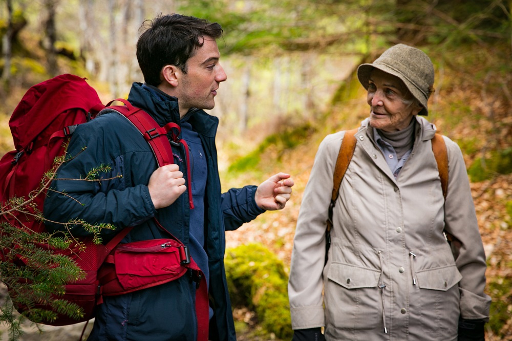 When she disembarks in the morning, she’s knocked over by a couple hurrying for the train. The young man introduces himself as Jonny (Kevin Guthrie, pictured with Hancock) and offers her a lift in his Land Rover back to the west coast village where he happens to live within striking distance of Suilven. There being no free beds owing to a fishing festival, he puts her up in his quite disgusting bedroom, though receives little thanks. In truth Edie is a difficult and aggressive old bag. But she needs help getting up the mountain and hires Jonny as a trainer. With a failing outward-bound shop to run, he takes on the job in order to milk her of her money. Sure enough, their relations thaw and an inspirational odd-couple movie is born. But will their developing bond be enough to get her up the mountain?