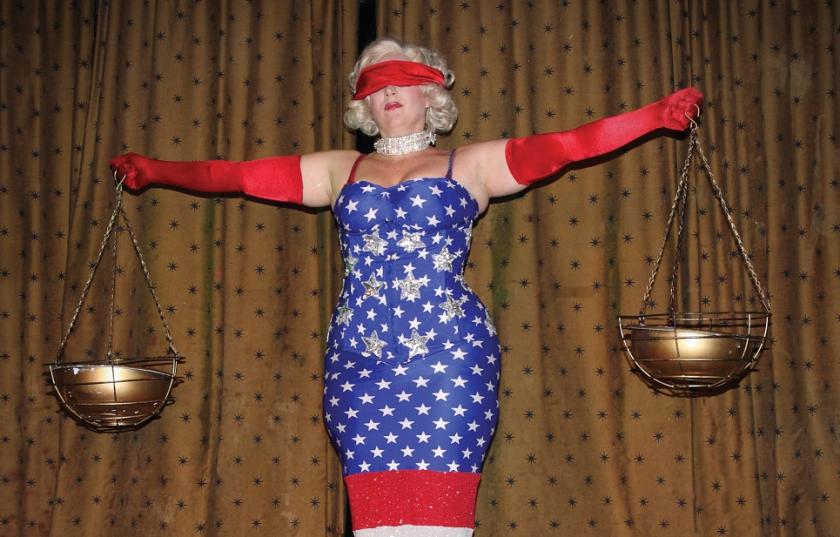 “Be bawdy, over-the-top, smart, eloquent,” urges Dirty Martini, explaining that while striptease is little more than voyeurism, burlesque really has something to say. In her “Patriot Act” sketch she first appears with the scales of justice (main picture above), before ripping ahead into an analysis of American consumerism, first digesting fistfuls of dollars through her mouth, before extracting them from her rear end in a long string, like sausages. Think about it.