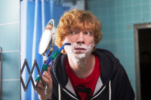 Sievey died in 2010. He initially attracted some attention with the Beatles-inspired new wave-pop of his Manchester-based band The Freshies. After adopting the persona of Frank Sidebottom, he was booked to play London in 1987 just as his keyboard player dropped out. The entertainments officer of the college where the gig was taking place stepped in with no notice and then joined the band. That new member was future journalist Jon Ronson, who co-wrote Frank. The film loosely draws from the experience with Domhnall Gleeson as Jon (pictured below), the Ronson analogue. That is where the real story of Sidebottom/Sievey and Frank the film part ways.