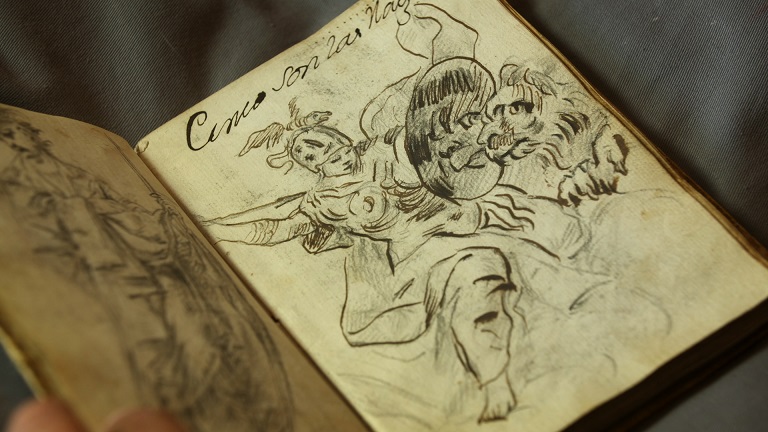 Goya’s 1771 Italian notebook was rediscovered in 1993, and due to its fragility can never be exhibited, but here the Prado’s curator of prints and drawings turns its pages, showing us Goya’s attractive disorder (pictured above). He makes lists of all kinds, including the reigns of the Popes, what implements to use for painting and drawing, bank shares he has bought, the fountains of Rome; he records his wedding date, keeps accounts, notes ideas, and above all sketches from paintings and sculptures and animals from the life that he has observed, fragments to be used in later work, all in a wonderfully untidy tangle exhibiting an omnivorous curiosity and zest. It is a chaos of fact ordered by Goya’s own observations and imagination, the effect as though we were looking over his shoulder.