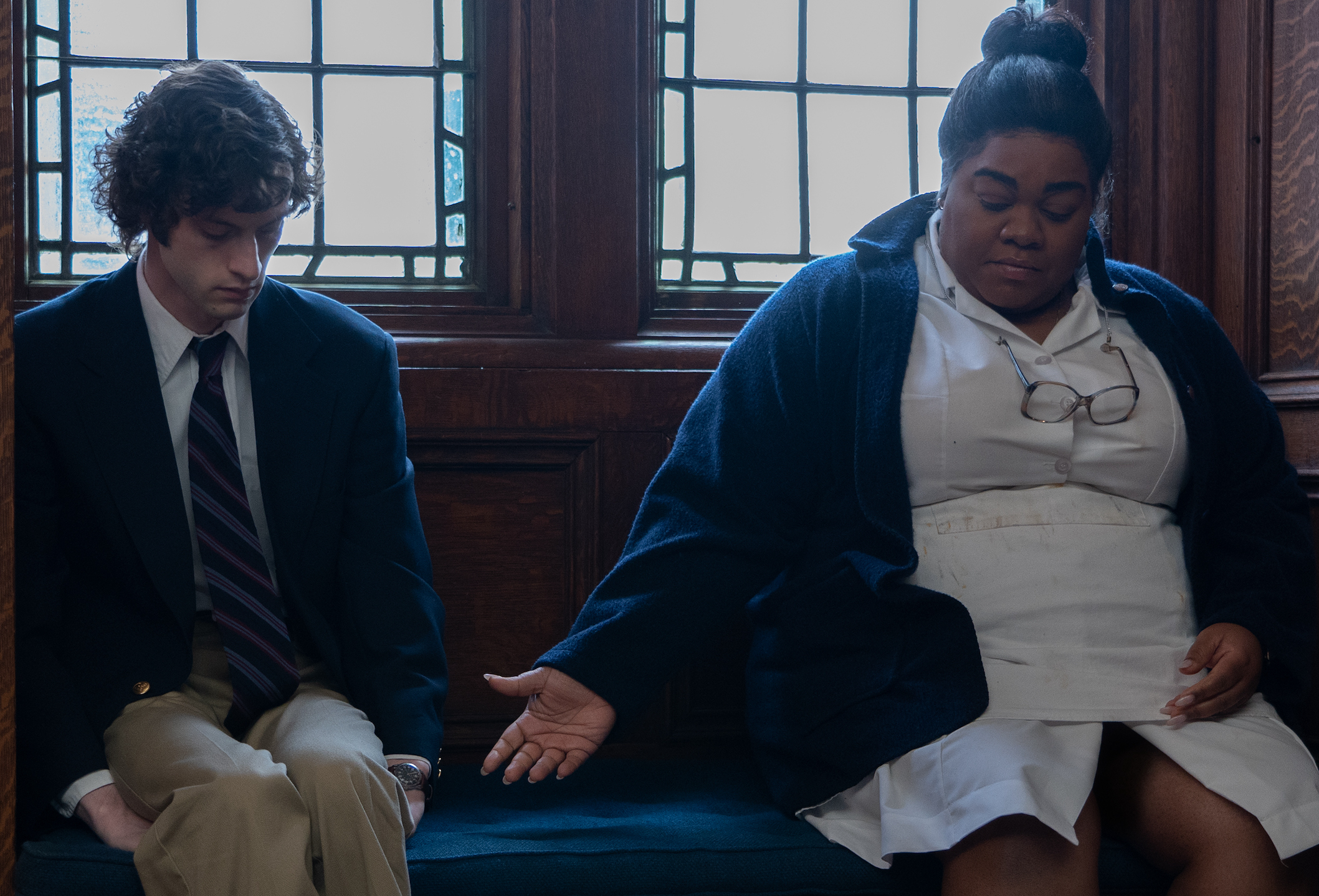 Also left behind is Mary (Da’Vine Joy Randolph, pictured below with Dominic Sessa), the school’s black head cook, a single mother who is steeping herself in melancholy – and whisky – at losing her only son in Vietnam. Curtis’s uniformed portrait stares out disapprovingly from the school chapel as the chaplain delivers a peerlessly insincere sermon to the visiting parents and pupils.