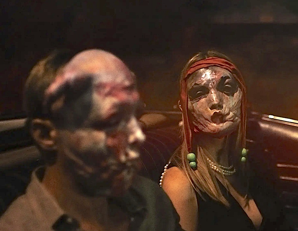 Themes of identity and loss thereof start to creep in as James finds himself embroiled in drug-addled orgies with this unsavoury cabal. Though one of the cops insists that “our country is not a playground for foreign children”, that’s exactly what it is, a honey-trap for voyeurs and thrill-junkies who feel only contempt for the local population (illustrated in the way Gabi and her friends toy carelessly with grotesque ethnic masks, pictured above). This audience of ghouls are thrilled to watch the slaughter of the clones, and James is sucked into a vortex of self-annihilation which plays out all too literally.
