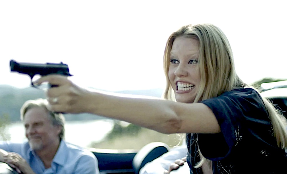 All of which makes him fair game for a group of sleazy sensation seekers who have found Li Tolqa to be the destination of their dreams. However, this is not because of the scenery or the weather, as James discovers. It all begins when he meets fellow guests Gabi and Alban Bauer (Mia Goth and Jalil Lespert) at their luxury resort hotel. It’s Gabi (an imperious performance by Goth) who breaks the ice, professing groupie-like enthusiasm for James’s novel. The two couples team up for a day of driving around the countryside, which might have seemed harmless except for the part where Gabi surprises James by giving him a hand-job (complete with a startlingly graphic ejaculating-penis shot). Not that he makes much effort to stop her (pictured above, Goth goes gun-crazy).