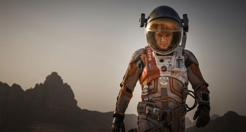 It’s day 18 of a manned mission to Mars. Scientists are collecting their samples from a very red desert plain, when a severe storm hits the planet. Commander Melissa Lewis (Jessica Chastain) decides to abandon the mission, but in the tumult of the storm botanist Mark Watney (Matt Damon, pictured below with Chastain) is separated from the group. Assuming he’s dead, and with seconds to spare, his colleagues take off without him.