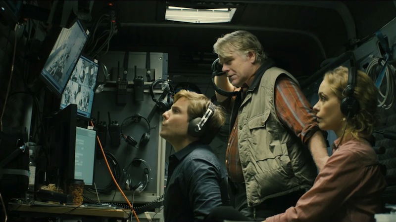 Bachman is central to many of the dynamics, whether nurturing or cajoling his contacts, coercing the banker and lawyer to do his bidding, playing politics, or – the lightest aspect of the film – providing the leadership and inspiration to his team (including Nina Hoss and Daniel Brühl, pictured left with Hoffman). And though the whole cast delivers, it’s Hoffman’s show.