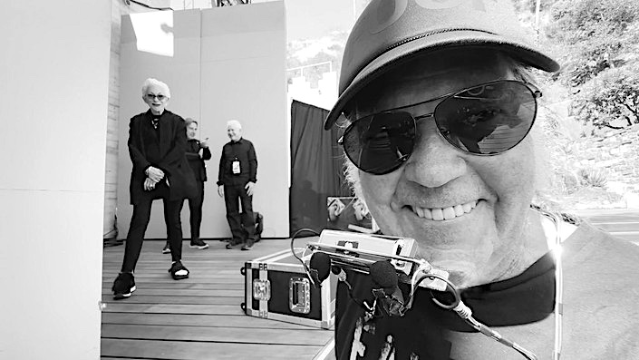 It’s been shot in black and white, apart from a concluding landscape scene as the titles roll, with plenty of shots of Young and his small crew travelling on his bus or preparing the stage set-up. There’s ongoing banter between Young and his driver, Jerry Don Borden, as they while away the hours on the freeway groaning about traffic jams, reminiscing about Howard Hughes or discussing the phenomenon of mice on tour buses.