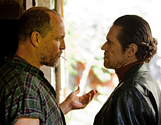 DeGroat is pretty much the devil incarnate, which seems to suit Harrelson well enough, since he projects an almost tangible force-field of feral menace. Cooper hasn't bothered giving DeGroat any redeeming nuances - the film opens with a scene of him at a drive-in movie with a female companion, whom he viciously humiliates before battering an interfering bystander senseless. With his gang of hillbilly lowlifes, he runs a private criminal empire of fights and meth-dealing, and the cops have withdrawn to a safe distance to let them get on with it (pictured below, Woody Harrelson with Willem Dafoe).