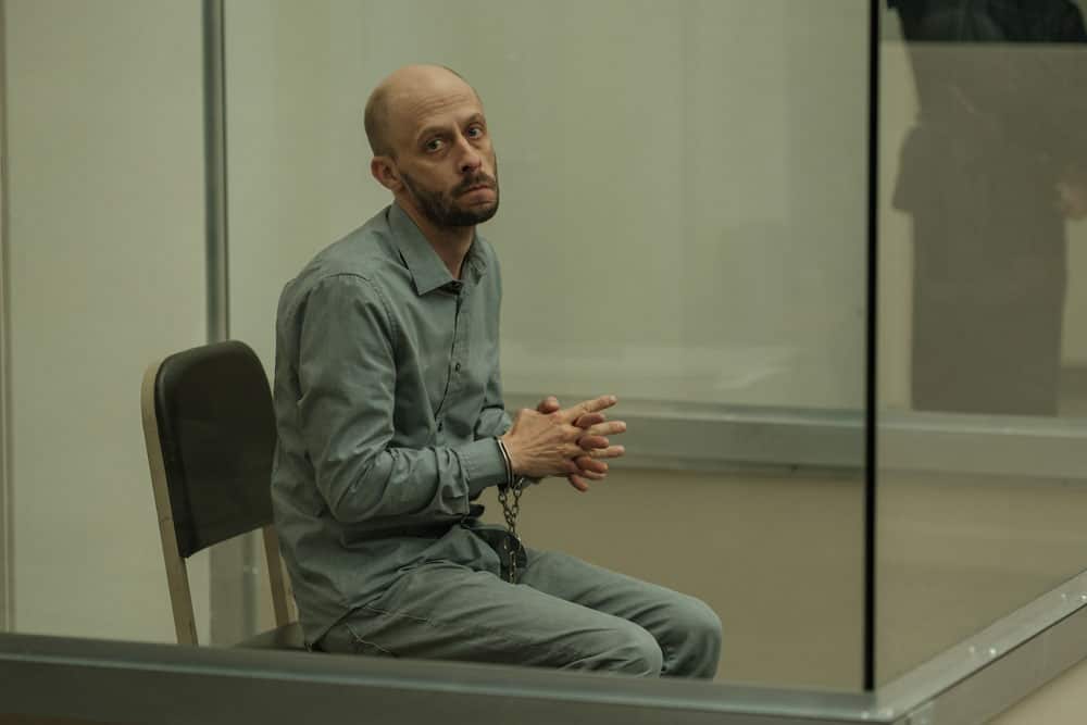 During the first 20 minutes, you might expect this to be another sleek French-language courtroom drama like Alice Diop’s Saint Omer or Justine Triet’s Palme d’Or-winning Anatomy of a Fall from last year. As the camera slowly pans around the cold, modern-looking courtroom, we hear the prosecutor and the defence give their opening remarks. We learn that the man on trial, Ludovic Chevalier (Maxwell McCabe-Lokos, pictured below) is charged with a heinous crime: kidnapping, murdering, and dismembering three young girls and live-streaming it on the Dark Web in so-called Red Rooms, long-thought to be an internet myth.