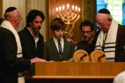 SeriousMan3Flash forward to the main story. It plops us back in the Mid-West, a Minnesota garden suburb so new that it has no trees. The Coens grew up hereabouts. It is 1967 and Danny Gopnik (aged 13, as Joel Coen was in that same year) is more interested in smoking dope and listening to Jefferson Airplane than cramming for his bar mitzvah. (Right: Aaron Wolf, centre, as Danny, framed by Joel Coen, second left, and Ethan Coen, second right).