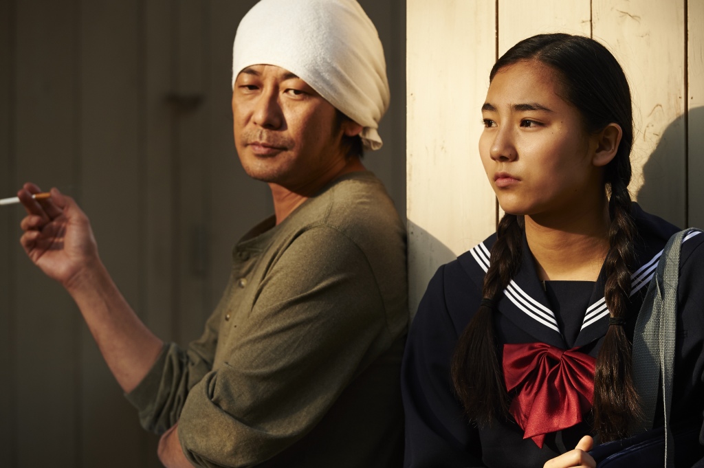 Fans of frenetic foodie movies like Tampopo and Udon will find little zippy comedy here; this is more like a homage to the measured cinema of Ozu and Mizoguchi. The camera focuses on cherry trees crowding out the city’s overhead wires; lens flare fills the frame and puddles brim with fallen blossom. The odd couple in the shop are joined by a school girl with an unhappy home life, Wakana (played by Uchida Kyara, Kiri’s real life granddaughter, pictured above with Masatoshi Nagase) and the stories of the three unfurl and entwine in a leisurely way.