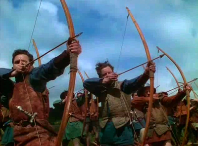 Further endorsement for Britain’s archery credentials are Robert Louis Stevenson’s underrated novel The Black Arrow, which owes much to Robin Hood and was exquisitely illustrated by Wyeth, the swarm of arrows fired by the English archers at Agincourt in Olivier’s Henry V (pictured above), and the arrow that thuds into a roundel in the logo of Michael Powell and Emeric Pressburger’s film company, the Archers. This year (perhaps with the Olympics in mind) Hollywood has come up with two doughty female archers – Katniss Everdeen in The Hunger Games and Merida in Pixar’s Brave, but at least the latter is a medieval Scot.