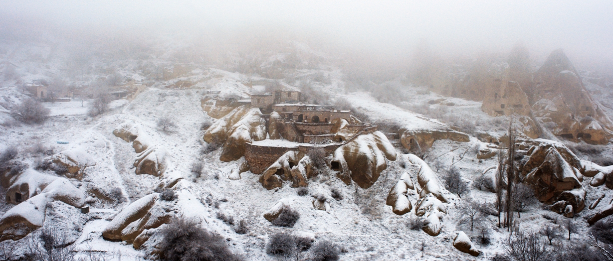 The film’s central location is a hotel in the spectacular visual surroundings of the troglodyte cliffs of Cappadocia (pictured below), a visual feast that takes in exotic rock formations and muddy roads, wild horses galloping freely, and later on blanketing snow. It’s the property of Aydin (Haluk Bilginer, main picture) – his name means “intellectual” in Turkish – and here he’s the “king of a small kingdom” who after a successful career as an actor has returned to his family estate to write a book, as well as weekly columns for the local newspaper. He lives there with his much younger wife Nihal (Melisa Sözen, pictured, bottom left), though their relations have clearly cooled, as well as his sister Necla (Demet Akbağ), who has spent part of her life in Europe, coming back home to recover from a divorce. It being the depths of winter, the hotel has few guests – some Japanese tourists, a roaming Turk on a motorbike – so it’s effectively a family home, administered over by Aydin’s steward, the long-suffering Hidayet (Ayberk Pekcan), who is also responsible for the rest of the estate property, including collecting rents from its tenants.