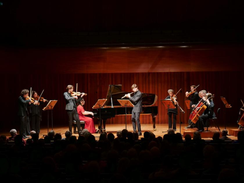 So it was fitting that we started with the fifth Brandenburg Concerto. This had Gould and flautist Thomas Hancox as soloists, with van den Bercken on the piano (the three pictured below), starting in the role of accompanist before elbowing her way to the fore in what she described as “the first piano concerto”, the beginning of a path that ultimately led to Rach 3. It is unusual to hear Bach ensemble music with a piano, and some people would reject it out of hand. I found it sounded a bit strange as continuo, but was perfect when the extraordinary cadenza at the end of the first movement emerged, Bercken’s lightning-fast ribbons of notes flowing like melted butter, and we could see in this Bach a glimpse of the concerto’s future as a form. Britten Sinfonia concertNext was a premiere from Dutch composer Mathilde Wantenaar (b.1993). We heard her new Rhapsody for piano and strings, 14 minutes of music that wasn’t profound, but didn’t aspire to be, aiming at “playful” and “fun”. It was certainly both of those. Its episodic form, driven from the piano, called to mind Rhapsody in Blue, but rooted in a folky modality where Gershwin used jazz. There were nods to Bach in the fugue that emerged in the latter parts – bassist Benjamin Russell showing fleet fingers – and van den Bercken’s playing was perky and full of character.