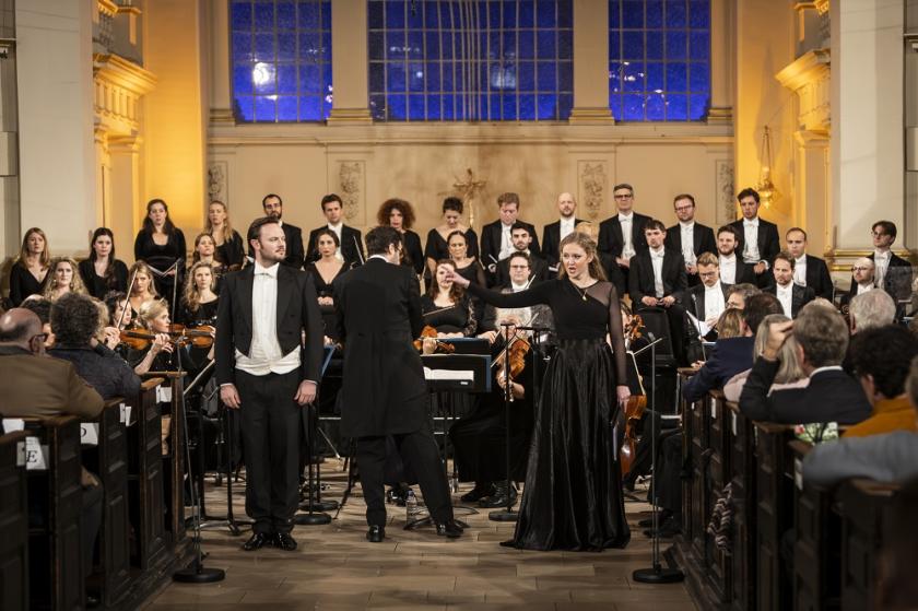 He came on last night to bounce standing upper strings and woodwind into life with an Overture that’s more memorable than most of those for the operas – because it’s a recycled Concerto Grosso. The rest was the epitome of slow-fast, happy-sad/reflective numbers intensified by Jennens’ clever interplay of Milton’s contrasting moods, kicked off by two remarkable singers acting out the initial recitative-spat. “Hence, loathed Melancholy”, declaimed that most vivid and delightful of tenors, Nick Pritchard, and with “Hence, vain deluding joys”, Bethany Horak-Hallett gave as good, dramatically and vocally speaking, as she received.