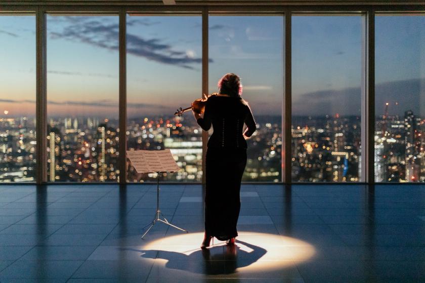 An entirely stark and empty floor at 100 Bishopsgate was the perfect location for Classic Sound to capture the haunting audio that needed to emerge from complete desolate silence. Such a resonant acoustic highlighted the loneliness and hesitancy of the unaccompanied violin and so Darren’s composition Rising was born. Using the space again as we all watched the sun set over the City from the 34th floor, with multiple cameras to create Antonia’s vision, is something I will never forget. As this was an evening close to Bonfire Night there were dazzling fireworks all around our 360 degree panorama, so the wonderful contrast between the feeling of being alone so high up and knowing there was life far below every time we saw sparks flying.