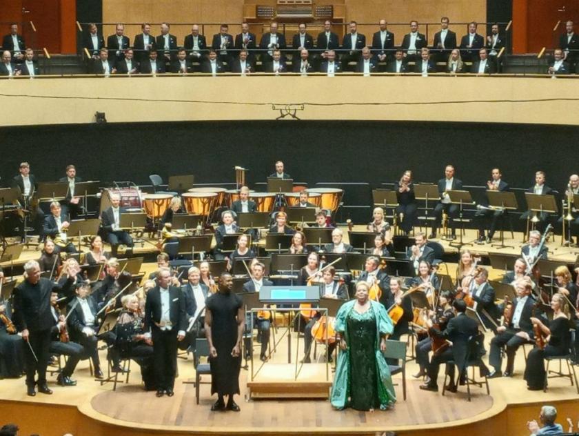 Scores didn’t impede their commitment. Charismatic American bass-baritone Davóne Tines (pictured above with Lintu) appropriately dressed in battle skirt and blue stockings, just about managed the insanely high cursing at the end of the movement (a stress-point which had led even as magnificent a baritone as Peter Mattei to give up mid-performance). Johanna Rusanen reflected every mood with vivid communication and bright, unassailable tone. I’d love to see her as Brünnhilde, a role she’s sung at the Finnish National Opera with its music director – Lintu, of course (the week before the Sibelius Festival, he’d conducted the second act of Tristan in Helsinki). 7/9: just discovered this entire Ring is available on YouTube; what I've seen is stunning, and the interaction of the characters is very impressive.