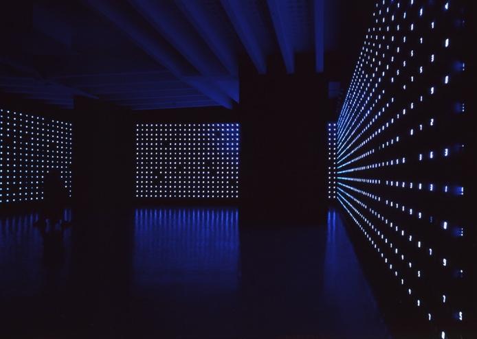 Miyajima's delicate gauze of blue on which float little digital numbers and the soft streaming light by Lucy Carter give the opening ensemble a serene, watery atmosphere, which once the gauze flies away yields to implied close-ups on pairs, as tiny incidents pass between couples. Yet we can’t get focused on any in particular as, like split-screen TV, several couples appear at once, in different tempi and moods. They don’t move much across the stage, instead displaying their flexibility in high splits or gymnastically engineered lifts, while a wall of pin-pricks of light gradually steals up upon them.
