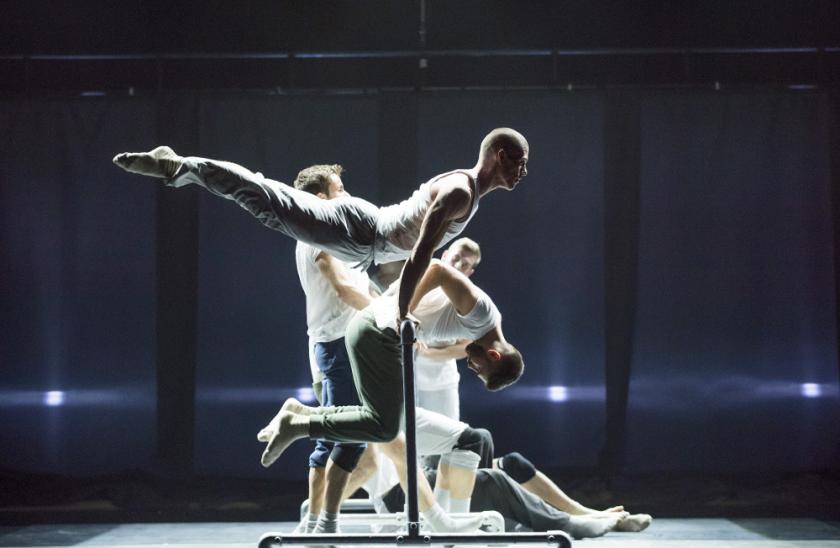 Marc Galvez and BalletBoyz dancers in Javier de Frutos's' 'Fiction'. Photo credit: Tristram KentonDe Frutos's piece, Fiction, is an altogether more torrid affair, though the passions are not those around romantic love (or, thank goodness, the Pope), but around death. With winning panache, the choreographer stages the piece as a reaction to his own imagined death, complete with a voiceover obituary written by theartsdesk's own Ismene Brown. The dancers are in practice clothes with a studio barre, and this object acts almost like a rock, on which the waves of their high-running emotions break as they work through their "loss": they limbo under and fly over it, balance on and tumble off it, cling on to and ricochet away from it. Lithe little Marc Galvez (pictured above left) is the chief mourner – or is he the lightning rod for everyone else's feelings? Either way, he's mesmerisingly centre stage for much of the piece, his small size used to good effect as he seems to dance over the top of everyone else, like flotsam tosssed on a high sea.