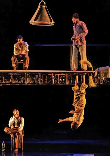Five people stand in the dark. A bleak gantry descends with a rumble onto their heads. They scuttle under it and flatten themselves to escape a crushing, but then they get up and start building. The platform is stripped of planks, rebuilt at crazy angles, refashioned while decorating the tasks with acrobatic surprises. At a steep tilt a plank is both a slide and human catapult, or makes a terrific wobbling noise if slapped right; as an upright it’s perfect for a girl to shin up and then array herself in a bouffant Boucher Pompadour dress of crumpled paper, later to be elegantly torn off in strips while she swings on a white rope trapeze.