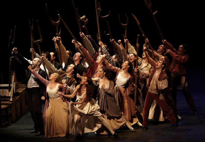 Gades handles his totemic parable with dextrous, exciting stagecraft, with Dominique You's cunningly spare lighting which creates sudden rooms, a small, hot tavern, a wide and unguarded open air, and Pedro Moreno's plain and effective farming props. It’s all of a piece with its tapestry of music, part live, part recorded - the lyrical songs of the land, the delightful community dances (in one, men skip abruptly up and down while women sway forward and back). While it’s kneecapped twice by bewilderingly gauche interpolations of the Russian Modest Musorgsky’s Pictures at an Exhibition used as “horrid music”, the baroque dances are a delightful mix with the hefty strumming live guitars and drums.