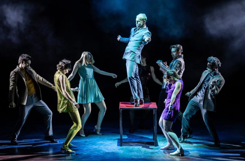 The piece looks a million dollars, though, stylishly designed by Christopher Oram, with videos by YeastCulture.org. In the first scene, the angular rock Jimmy and his four temperaments perform on is seemingly surrounded by water, with a dramatic aerial shot of the sea projected on the backdrop. The action moves seamlessly to the London streets, a café interior, Jimmy’s factory, his home, the Marquee club, a train to Brighton (pictured below, with Fitzpatrick, left, Will Bozier and Curtis Angus), all lifted by the projections and the moody lighting (Fabiana Piccioli). It presents a shadowy noir version of London in 1964 that could be mistaken for LA.Paris Fitzpatrick and ensemble in QuadropheniaThe Mods, too, despite their sharp suits (courtesy of Sir Paul Smith, no less), are not instantly identifiable as such. Only Jimmy has a ‘do a fellow Mod would have acknowledged. Eventually just the one scooter turns up, ridden in and out like a hobby horse, along with a couple of parkas (but no fox-fur trim). The women at least have perky mini-dresses to go clubbing in; and the Rocker mob, when they finally turn up en masse in the Brighton scene, are pitch-perfect in their leather jackets and turned up jeans.