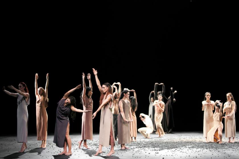It is in keeping with this powerful, palpable atmosphere that Waltz expands the stage to its fullest possible extent: with wings and back curtains removed, the performance space goes beyond what the proscenium allows us to see, and its boundaries are literally blurred by the pale floating dust that hangs over everything. Also hanging over everything - though this only gradually becomes apparent - is a huge metal spike, a needle-shaped Damoclean sword which descends in infinitesimal increments, reaching the floor with brilliant finality precisely at the moment of the Chosen One's final collapse.