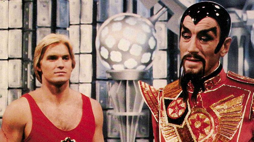 The plot is straight from Alex Raymond’s 1934 comic-strip, as Mongo’s Ming the Merciless (a silkily thuggish Max von Sydow) ravages Earth with freak weather for his own amusement, and plans to fatally wrench the moon from its orbit. Flash and Dale are kidnapped by Topol’s manic Dr. Zarkov on a spaceship to Mongo to avert disaster (“Get your toothbrush and whatever,” he distractedly advises). There Flash is lusted after by Ming’s lubricious daughter Princess Aura (Ornella Muti, pictured below with Jones) as Ming forces Dale into marriage. Escaping execution, Flash is bounced between forest moon Arboria’s Prince Barin (Timothy Dalton as the stern spit of Errol Flynn in Sherwood green) and the Sky City of Hawkman Prince Vultan (Brian Blessed in a much parodied performance of skilled exuberance), before leading a final assault on Ming.
