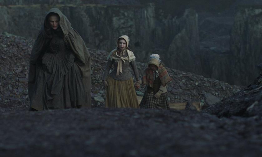 Filming in Wales in the dark winter months, cinematographer Adam Etherington has done a sterling job of creating a damp, gloomy landscape of louring clouds and threatening rocks. Oil-lamps cut through inky interiors and flaming torches play their role. Unfortunately atmospheric cinematography, impressive production design and a lovely selection of shawls don’t compensate for a thin script. The story-telling is so leisurely and the dialogue so sparse that the audience is left wondering where other relatives might be or why the local community is so hostile to the family. The villains are caricatures, practically twirling invisible moustaches as they torment the women.