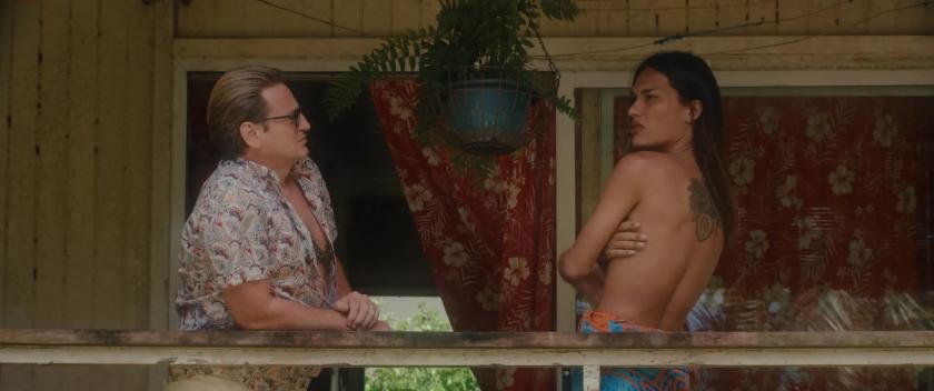 De Roller loves hanging out backstage at the garish Paradise nightclub and catches the eye of a beautiful trans woman dancer, Shannah (exquisitely played by Pahoa Mahagafanua in her debut). When she’s working her hotel reception day job, he pumps her for information about the Portuguese. (Pictured below: Mahagafanau, centre, and Magimel)