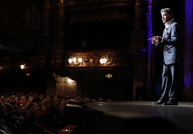 “There’s not much more I can do in action apart from explode,” says Sylvester Stallone with a grin on his face on being asked about the next step in his career. Following a video montage of the sweaty, musclebound action heroes Stallone is adored for (minus any clips from Rhinestone, his musical collaboration with Dolly Parton), a jolly and reflective Stallone took to the London Palladium stage in sharp suit full of sage advice and revelations about his writing process. From the centre aisle of the Royal Circle, Sly looked fit and healthy and, thanks to the entire evening also being projected on a 30 ft screen, one could admire Stallone’s red, crinkly complexion from afar.