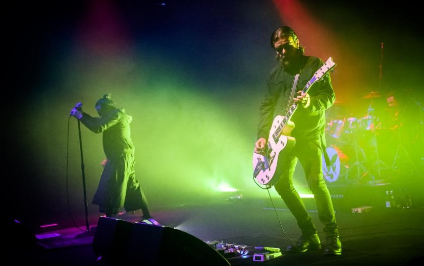 Before the band even appeared, Birmingham’s Institute was saturated in thick dry ice but that didn’t stop one of the roadies from then stalking the stage with burning sage to bless the performance. When Death Cult did arrive though, it was like a gang of post-punk Dorian Grays had hit the stage. Ian Astbury was dressed in a long black coat with jet black shades and a man bun, giving the impression that the rock’n’roll lifestyle hasn’t done him the same damage as normal life had inflicted on the majority of the audience – a good many of whom had significantly more hair on their chins than their crowns. That said, it didn’t stop some serious action going on in the mosh pit from the first notes.