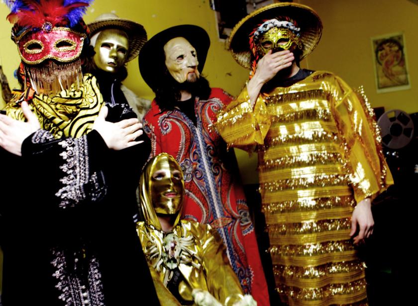 This is what Goat look like: There are seven of them, five band members and two front-women, the latter constantly whirling about the stage like dervishes. One of the guitarists and the bassist are clad in dark attire with black cowls over their heads akin to those worn by nomadic Arabic riders in the Sahara – but also a little like hangmen. The second guitarist has on a beanie hat underneath which resides a gold mask, as if he were a sinister ancient deity returned to haunt an Eighties B-movie. The drummer, in an Afro-flavoured smock, wears a mask that’s part bird, part skull, and the bongo-player, perched at the front, has a necklace of bones and a dome-shaped hat whose front rim bleeds into ratty straw-like straggles that make him look abjectly horror filmic.