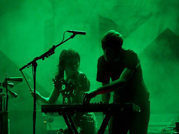 Anyway, Little Dragon are clearly doing something right, because the packed crowd were steadily roused to their feet by the non-stop stream of rumbling, thumping tunes delivered by the five-strong band - four blokes plus Nagano; the blokes were nerdy types with jeans and beards, while the rather more glamorous Nagano wore spangly shorts, a halter-neck top, and knee-highs. What impressed me was that they seemed to be playing almost all of the music themselves, rather than relying on backing tracks; this is a difficult trick to pull off with dance music, given its requirements for precision, and it was one that owed a great deal to the clipped, sharp, economical drumming of Erik Bodin.