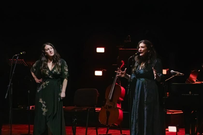 On stage, sisters Rachel and Becky and musical arranger and pianist Adrian McNally are joined by a many-textured band of players –, Will Hammond’s drums and vibes, the low, breathy sax and clarinet from Faye MacCalman, longtime band member Niopha Keegan on fiddle, guitarist Chris Price and bassist Dan Rogers. MacCalman’s sax and Keegan’s fiddle, blending with Hammond’s celestial vibes and the supporting framework of spare, spectral electric guitar, double bass, harmonium and piano, creates wonderful tone beds for the sisters’ voices to rise and expand upon.