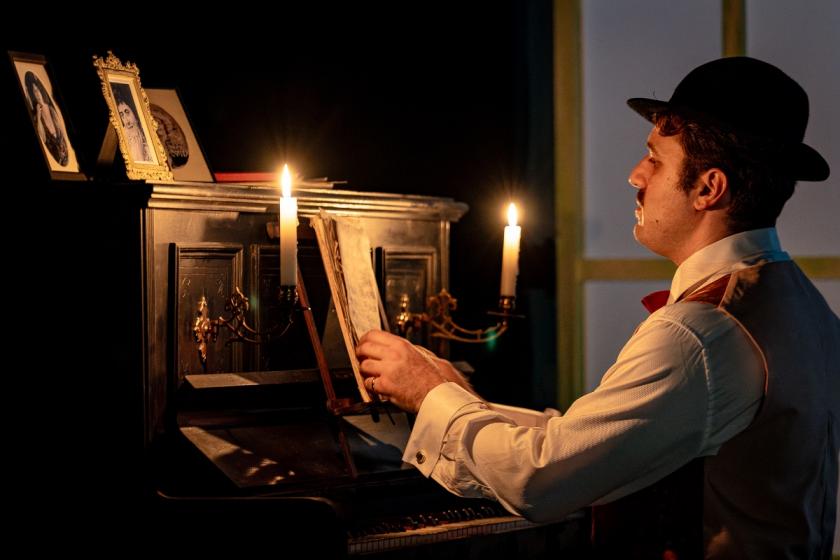 To celebrate the anniversary, they’ve done something very different from the more-or-less complete opera productions that were often a highlight of high summer in the leafy lanes not far from Jodrell Bank. It’s a complete new piece of theatre with music, commissioned and created in-house, telling the life of Puccini and adorned with excerpts from his scores.