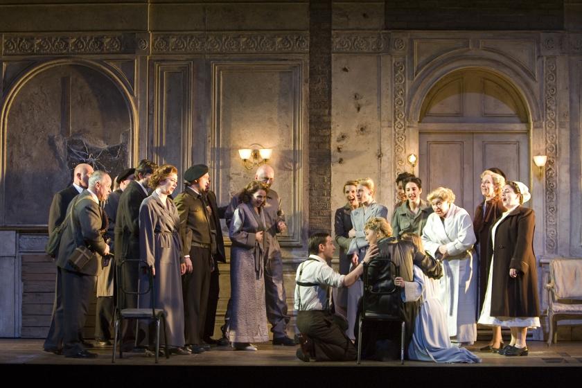 The oratorio genre gave him a pretext for some terrific choruses, not normally possible in opera of the day. But the forms are sculptural, cut in stone, not dramatic in the narrative sense. Fugal choruses and da capo arias (ABA form) don’t go well with the kind of bustling action that Katie Mitchell imposes on them. Above all they conflict with the clichés of modern production: the inevitable stout men in grey suits and trilbies, the women in their drab, calf-length dresses and silly, percher hats, the political apparatus of modern teledrama, the maps and campaign tables, the flash cameras, the servants faffing around with documents and blankets while singers are battling with difficult coloratura. The omnipresent chorus makes nonsense of certain scenes, but can’t be got rid of. As for the “thousands of armed cherubim” who secure Jephtha’s victory, one can only blink at the thought of a modern state that counts on (and gets) this kind of help.