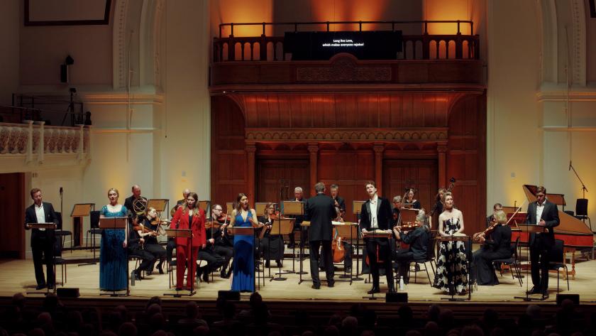 In a way, a concert staging – with the cast of seven singers lined up in front of the period-instrument orchestra (pictured below) – simplifies matters by bringing the music to the fore. Freed of the need to visualise (say) the lurching Act Two transition from estate gardens to a craggy forested mountainside, we can sit back and enjoy Mozart flexing his melodic muscles, and (above all) learning to craft sophisticated vocal, and emotional, dialogue, from rapt duets to a pair of intricate sextets.