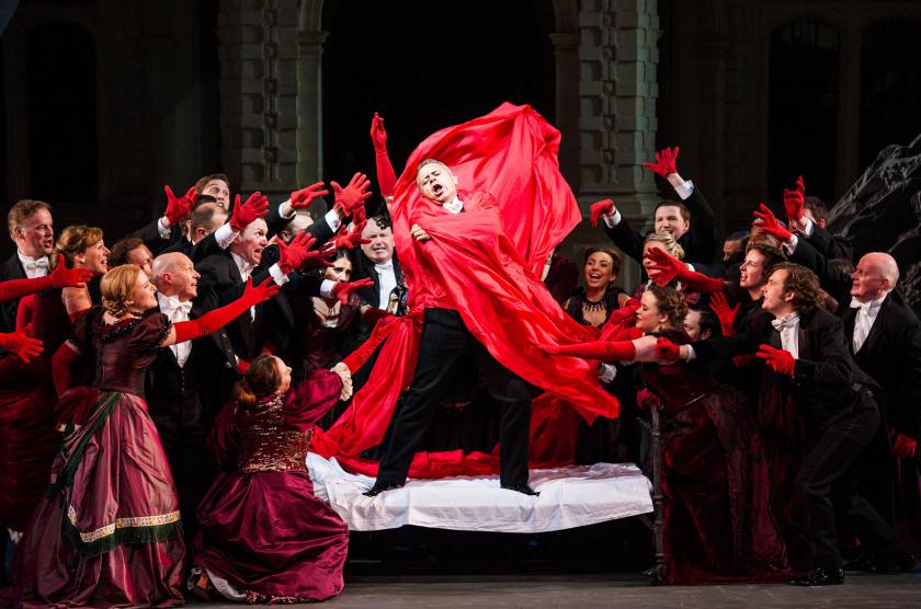 If Fatykhova’s Lucia was something of a cipher, the same could not be said for David Stephenson’s Enrico, who led the cast dramatically with his charged restraint. While Aled Hall’s pantomime Arturo loaded the dice emotionally, Stephenson was allowed to inhabit an altogether more interesting No Man’s Land of character, pitting duty and self-interest against each other. Strongly sung, he was more than matched by Aldo Di Toro’s Edgardo (pictured below). Personable in manner, Di Toro’s tenor is also unusually attractive, blending the warmth of its lower registers all the way up through the voice to the resonant top. Nothing is too bright or too forward, and the contrast with the sheen on Fatykhova’s tone shows both voices to advantage in duet.