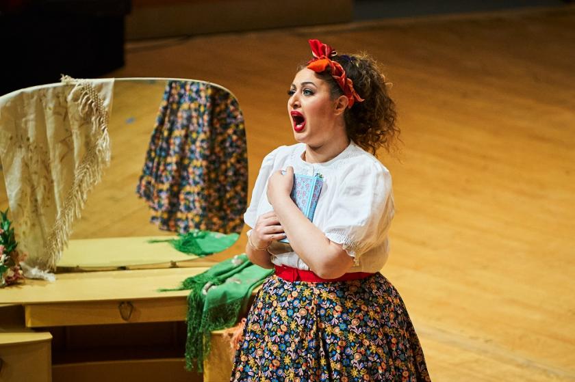 Stravinsky’s Mavra, 100 years old this May, is about as different as you could imagine: chalk and cheese indeed. This very short (25 minutes) one act comic opera has a much smaller orchestra and a cast of four singers, only one of whom (Dolgov) performs in both operas. He plays Vassili, clandestine lover to Parasha, sung by the irrepressible Armenian Anush Hovhannisyan, the cast completed by a bossy mother (Sarah Pring, pictured above with Stratford and the orchestra) and a nosey neighbour (Lea Shaw). Vassili dresses up as a newly hired maid Mavra so he can be together with Parasha -- and you can guess the rest of the slender plot which tumbles joyfully along until the mother finds out the duplicity and faints. Curtain.