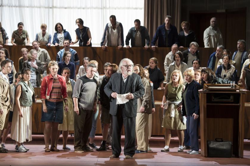 The rest of the cast are soloists who step out of the chorus. All are excellent, despite costumes and production that largely undermine their particular character. At one point in the score, Schoenberg nervously indicates that his Four Naked Virgins should be naked only “to the extent that the rules and necessities of the stage allow and require.” With Wieler and Morabito he needn’t have worried. The girls are never out of their jeans, even when being “violated” in the cinema seats, a spectacle about as sensual (or believable) as sex in Ambridge.