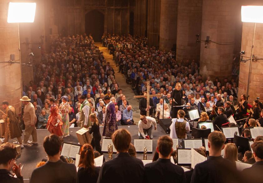 Now British Youth Opera has put together a production that has revealed a (to me at least) quite unexpected musical power and dramatic – if not strictly theatrical – force, under a masterly young conductor barely out of the Academy by the name of Charlotte Corderoy (pictured right). This was a semi-staged performance in Gloucester Cathedral as part of the Three Choirs Festival, and I have to say that the staging, such as it was (directed by Will Kerley), was more or less of an irrelevance (main picture). From halfway back in the nave little of it could be seen without craning one’s neck from left to right, while the TV monitors showed it only in bits and pieces alternating with shots of the orchestra and conductor. Moreover the young voices were now and then overwhelmed by the orchestra, so that one could sometimes follow the action, if at all, only with the help of the printed libretto in the (rather expensive) programme book.