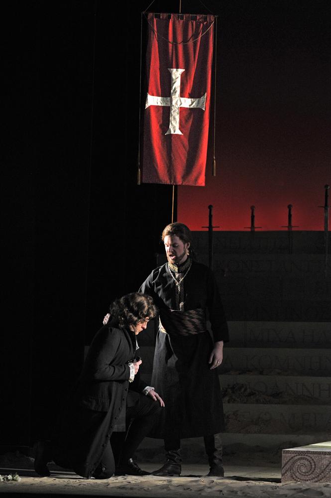 Both Rupert Enticknap’s Riccardo (pictured left) and Edward Grint’s Isacio were technically secure (though on the evidence of previous years I’d have been eager to hear Cast B’s Jake Arditti in the role of Riccardo). Enticknap felt a little ill at ease with the low-riding register of the role, struggling to project at times, but dispatched most of the coloratura with control. Grint clearly has more to offer than the role permitted, but relished playing the villain, and his “Nel mondo, nel abisso” was a delight.