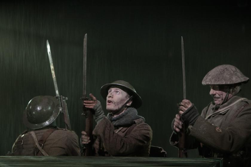 What makes the play as a spectacle is the work of the technical team. Jonathan Fenson’s design, focused on a large cobbled square, which serves for all purposes, is very realistic, especially when the rain pours down, as it frequently does. Emma Laxton’s soundscape, from the haunting call of the Boys’ Brigade Band off-stage to ear-splitting gunfire, and Charles Balfour’s atmospheric lighting are terrific.