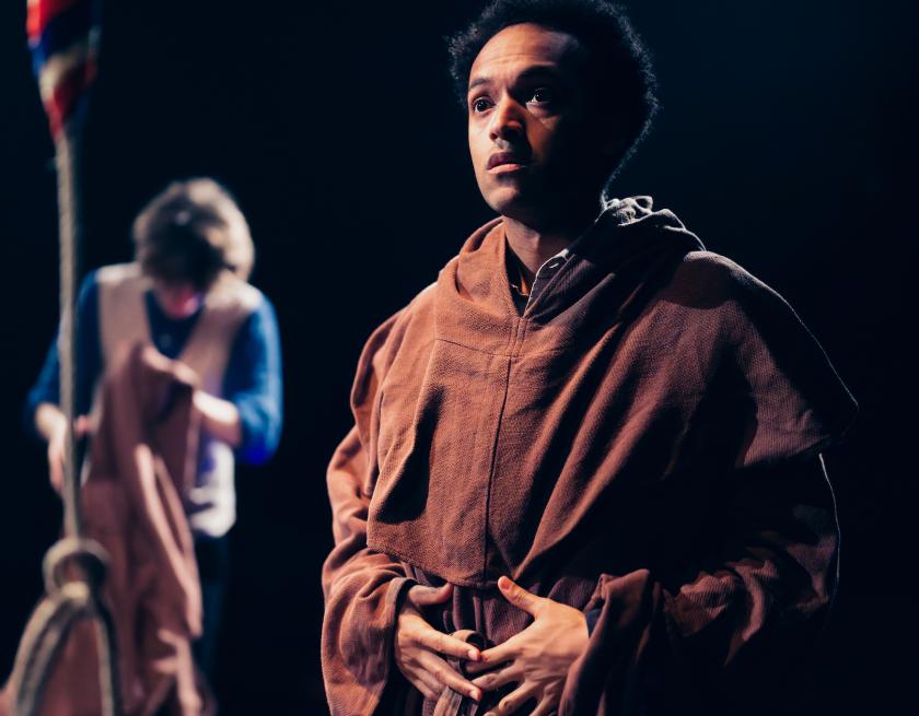 The scene throughout is a belfry, with bell-ringing ropes hanging overhead, where two men in monks’ habits have just arrived. Outside, rain is beating down. The two men, Aspinall (Paul Adeyefa) and Clement (Luke Rollason, pictured below), begin to argue about when they should ring the bells, whether they actually need to be rung, whether they make a difference as the flood waters rise.