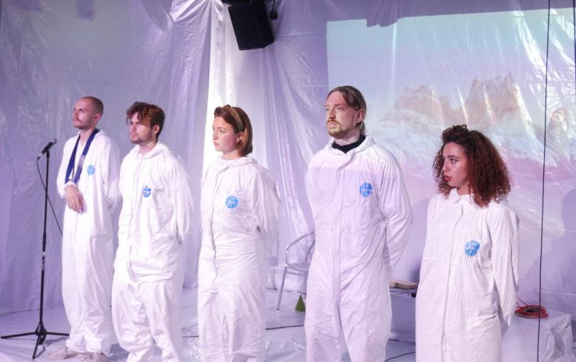 Nonetheless, PLEASE LEAVE (a message) is a carefully, rigorously structured show, one that plays with ideas of decay and dissolution as the already imperfect Yucca Mountain warning message disintegrates upon each of its returns as a chapter heading, and as actor Chris Whyte encourages us to question the truth of anything we’re seeing: is that shoulder injury for real? Performances are direct and deadpan, from Jack Hilton’s memories of a teenage break-up delivered via text message to Linda van Egmond’s apparently endless list of fears. The quintet’s nicely antiseptic staging provides a wonderfully fluent image for both rising sea levels and the unstoppable accumulation of information and detritus.