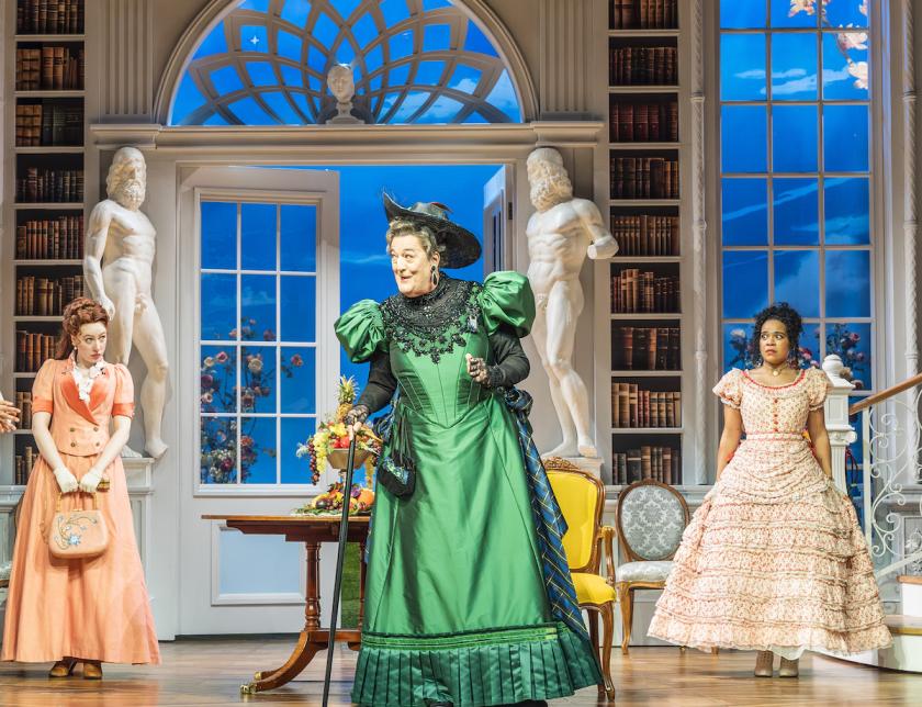 Max Webster’s effusively queer production, which opened last year with a cast that included Sharon D Clarke as Bracknell and Ncuti Gatwa as Algernon, is brightly designed by Rae Smith, with costumes that are simply, breath-takingly magnificent, and starts off as a joyful, flashy and exuberant reimagining of the play. As the curtain, which is graced with an old capacious handbag and overhung with a suitably ludicrous rotten-vegetable bouquet, rises, Alexander appears in delightful drag, pounding a grand piano. Wow! The show’s got off to a dazzlingly, a dizzying and hilariously crowd-pleasing start before a single word is uttered.