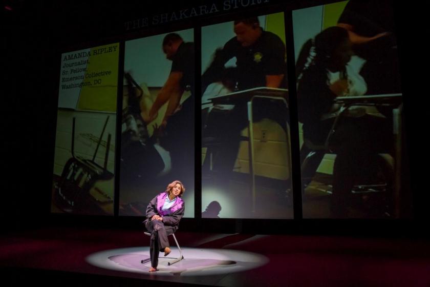 The next moment, she's Kevin Moore, the young black man who filmed Freddie Gray in Baltimore and whose death in 2015 from spinal cord injuries as the result of a police beating sparked violent protests. As Ifill, Smith sits tilted in an armchair: reflective, considered, a human compendium of policy decision and social inquiry. As Moore, the performer sheds decades, her physical movements and speech patterns becoming more jerky as outrage courses through her body.