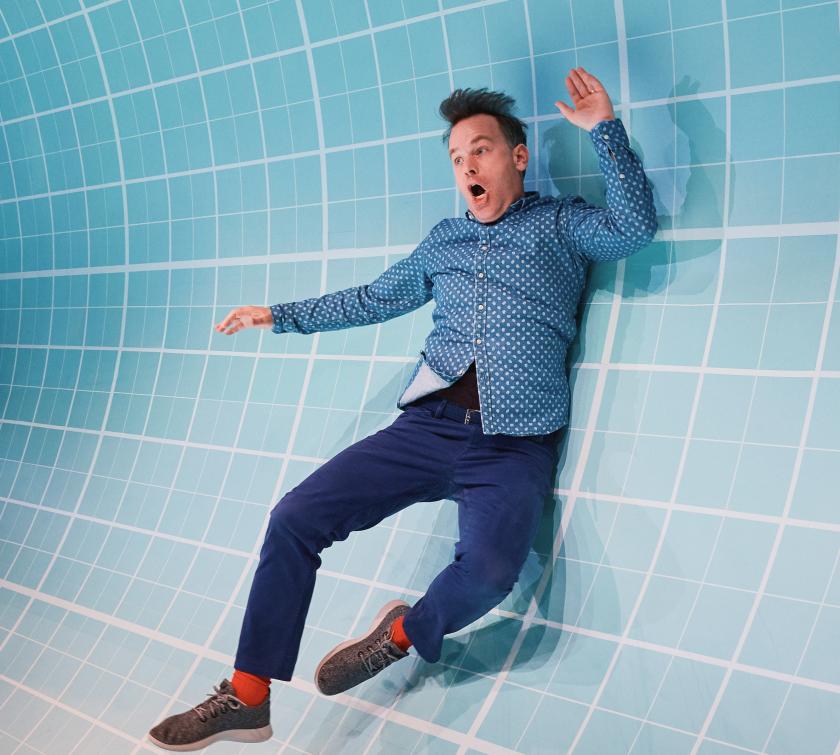 It seems unlikely that this theme could produce a stage act that has people constantly snickering and grinning from ear to ear. But Birbiglia is adept at mining all the little seams in this rich vein. He performs in front of a simple curved backdrop onto which the image of a tiled swimming pool wall is projected, along with sporadic graphics. And there’s a stool. That’s it. He peoples the stage, though, with a nonstop stream of dialogue that notes every nuance of the world’s absurdities, and also his own, with the conversational naturalness of somebody you just met at a bar. The script has melted away like surgical stitches.